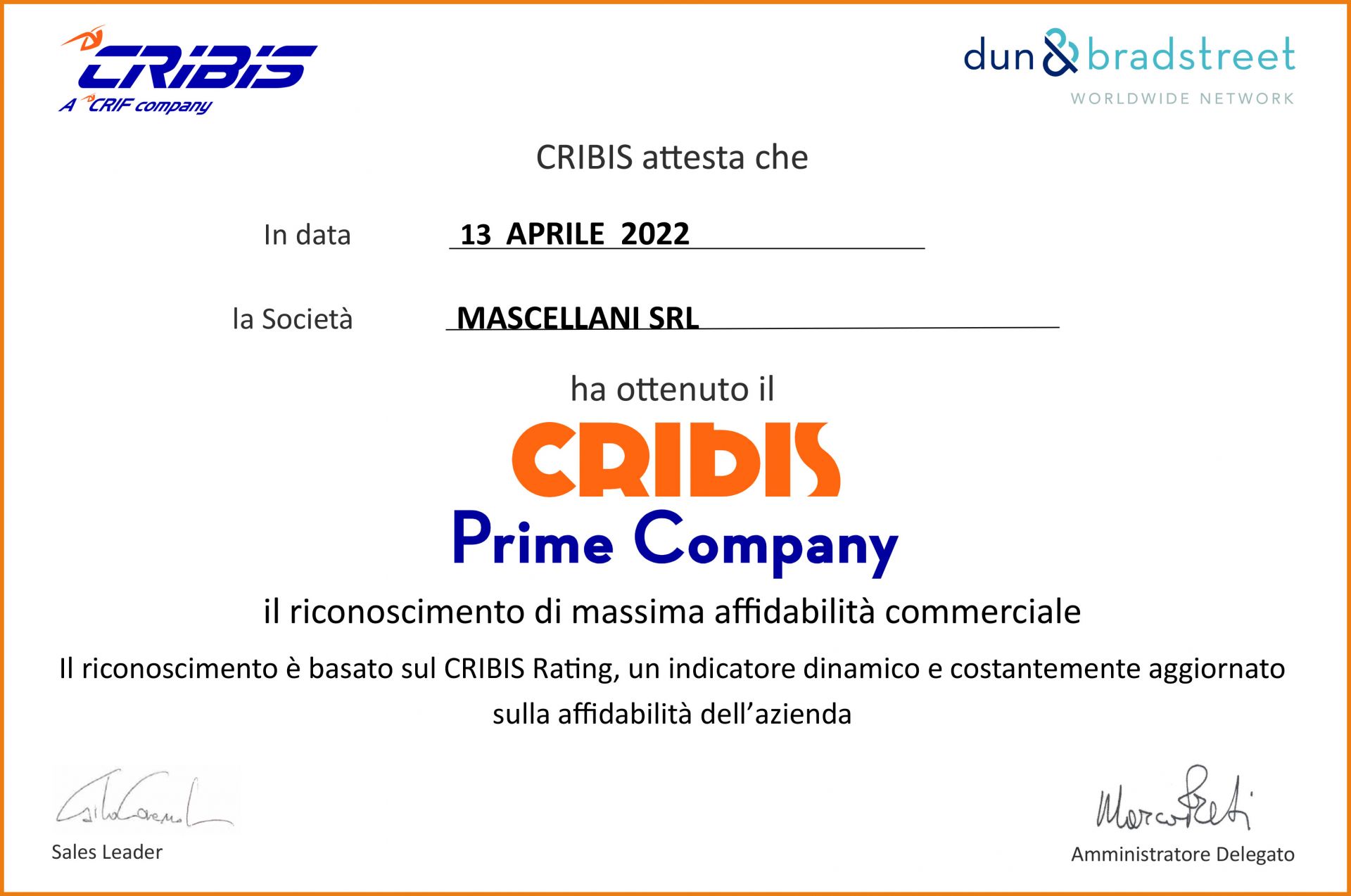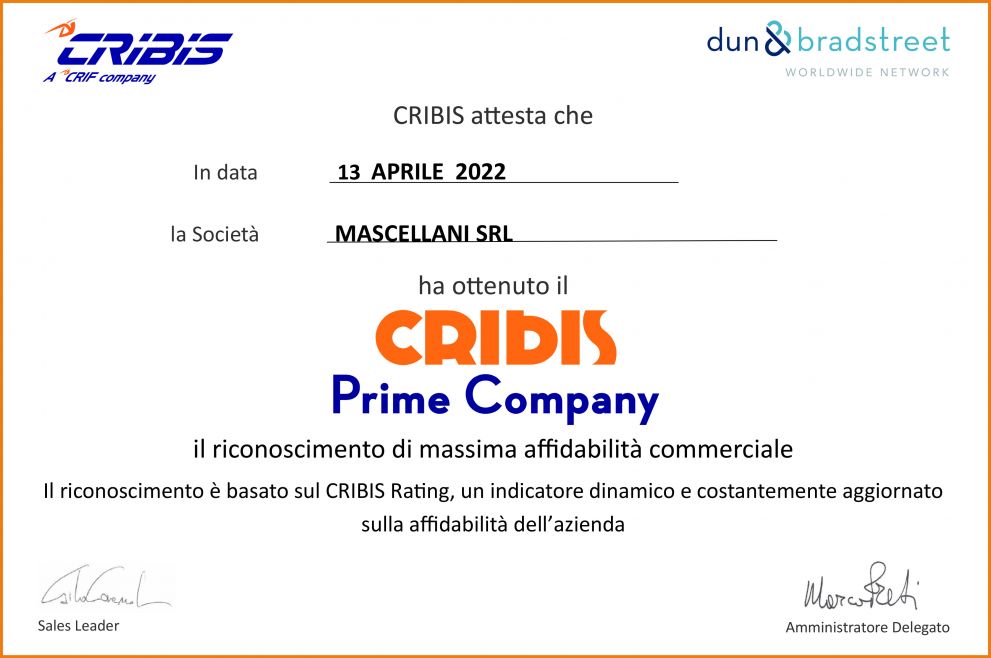 Mascellani SRL è orgogliosa di aver ricevuto il prestigioso riconoscimento da parte di CRIBIS come massima affidabilità commerciale, simbolo di una ottima e costante crescita aziendale.